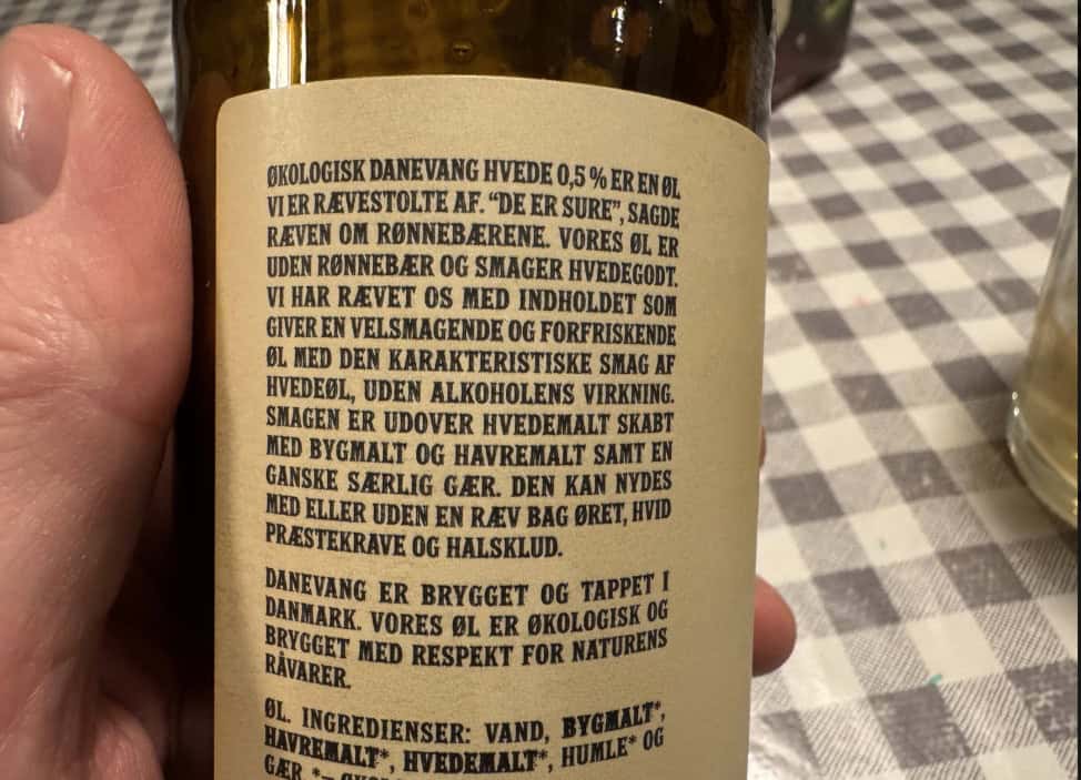 Økologisk danevang hvede 0,5% er en øl vi er rævestolte af. “de er sure”, sagde ræven om rønnebærrene. vores øl er uden rønnebær og smager hvedegodt. Vi har rævet os med indholdet som giver en velsmagende og forfriskende øl med den karakteristiske smag af hvedeøl, uden alkoholens virkning. Smagen er udover hvedemalt skabt med bygmalt og havremalt samt en ganske særlig gær. den kan nydes med eller uden en ræv bag øret, hvid præstekrave og halsklud. Danevang er brygget og tappet i danmark. vores øl er økologisk og brygget med respekt for naturens råvarer.